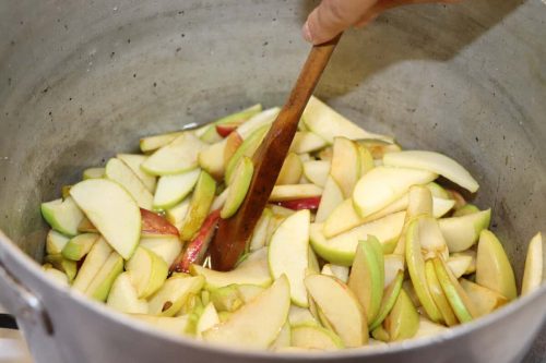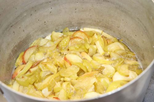 Добавям захар към ябълките в тенджера, разбърквам и оставям за час.