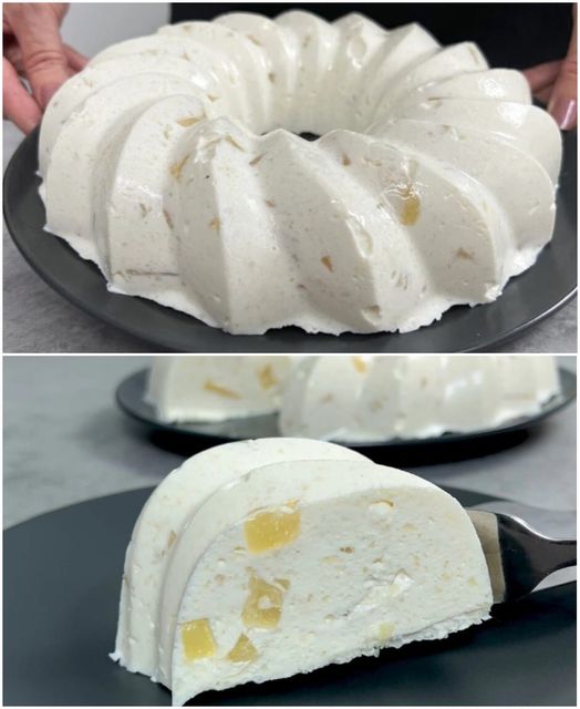 След това добавете нарязани парчета ананас в сместа с изварата, прехвърлете всичко във форма, за да се втвърди.