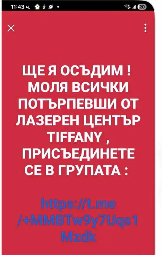 В групата „Мамите на Бургас“ във фейсбук се появи и следният призив: „Ще я осъдим! Моля всички потърпевши от лазерен център „Тифани“ присъединете се към нас“.