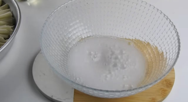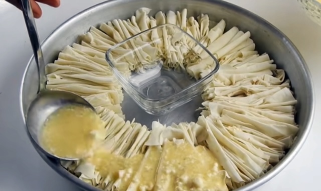 Намажете тавата за печене с масло, а в средата сложете купа или чаша. Нарежете корите на ленти с ширина 10 см, след което ги съберете като ветрило и ги наредете по ръба на тавата, докато запълните целия кръг.