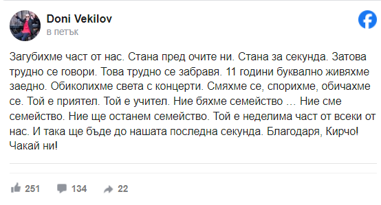 Той е неделима част от всеки от нас. И така ще бъде до нашата последна секунда. Благодаря, Кирчо! Чакай ни!“, написа Дони, а под поста му очаквано заваляха серия от коментари на потресени от случилото се приятели и познати.