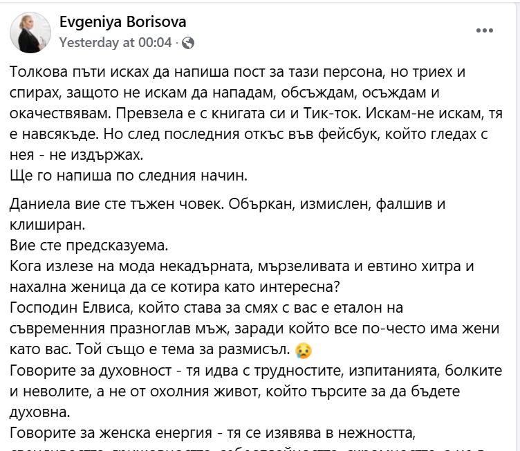 „Даниела, вие сте тъжен човек. Смутен, изкуствен, недостоверен и клиширан. Вашата предвидимост е очевидна. Говорите за женска енергия – тя се проявява в нежност, срамежливост, грижовност, отдаденост и скромност, а не в нахалство, меркантилност и претенции. Говорите за любов – вие не разбирате това чувство, вие продавате себе си и се търгувате без скрупули. Говорите за красота – това е оксиморон, като вземем предвид вашите неуспешни опити да се преобразите с помощта на неумели хирурзи“, написа остро Борисова.
