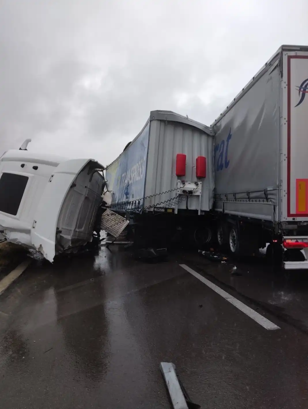 Магистрала „Хемус“ е парализирана след жесток сблъсък между два товарни камиона. Ударът е бил толкова силен, че возилата са сериозно смачкани, а по асфалта са разпилени части, които блокират движението и налагат пренасочване на трафика.