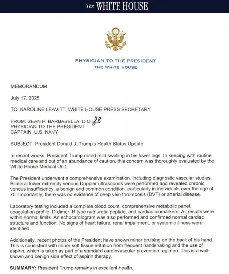 Белият дом публикува бележка от лекаря на президента, Шон Барбабела, който казва, че по време на медицинския преглед не са открити индикации за по-сериозно състояние, като тромбоза.