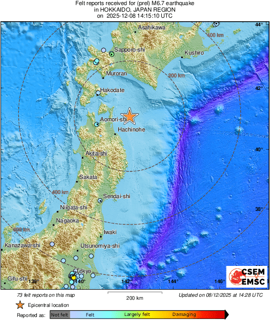 Земетресение с магнитуд 7,6 по Рихтер разтърси японските острови Хокайдо и Хоншу, показва справка в сайта на Евро-Средиземноморския сеизмологичен център. Епицентърът е на 135 километра североизточно от град Хачинохе, в който живеят над 200 000 души.Трусът, който е с дълбочина 29 км, е усетен чак в Токио.