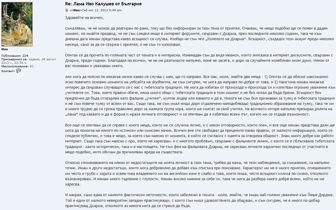 Журналистът Виктор Блъсков разкрива нови подробности около личността на Ивайло Калушев, който бе открит мъртъв край връх Околчица заедно с Николай Златков и 15-годишния Александър Макулев. Според проучването на Блъсков, Калушев е бил изключително активен в международния будистки форум „Dharma Wheel“, където е споделял нетрадиционни духовни виждания и теории.