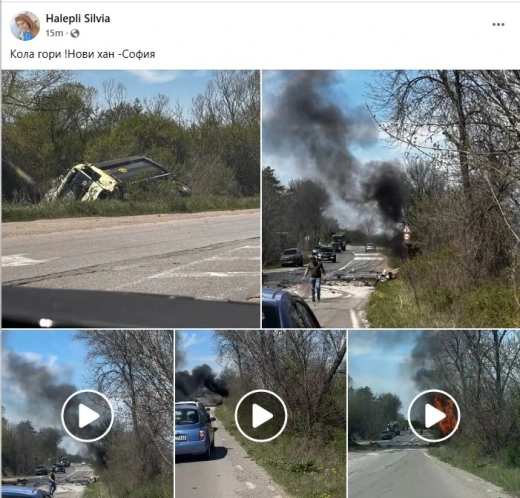 Тежка катастрофа е станала на пътя между Нови хан и София. Това става ясно от снимки и видеа, публикувани в социалните мрежи. На кадрите се вижда, че камион е в канавката и гори.