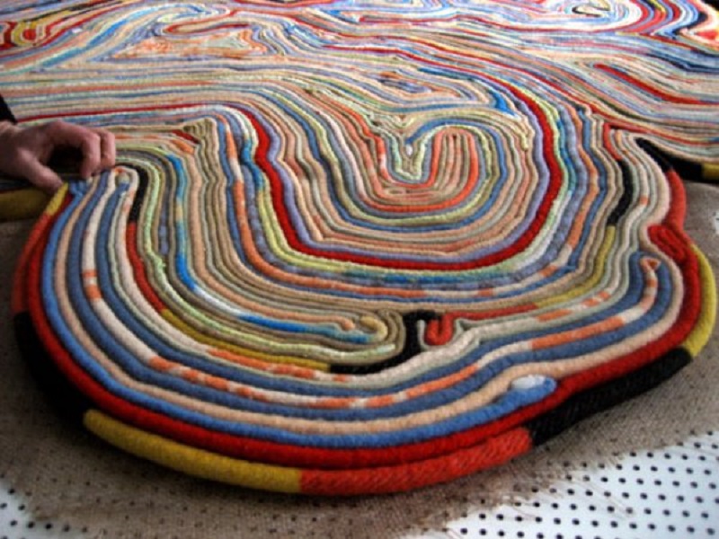 Трудно е да си представим, че подобна рогозка може да се направи от едно обикновено одеяло. За да направите това, го нарежете на ивици и ги завивайте на малки снопчета. Обмислете предварително моделът, следвайте зададената фигура, като започнете от средата.