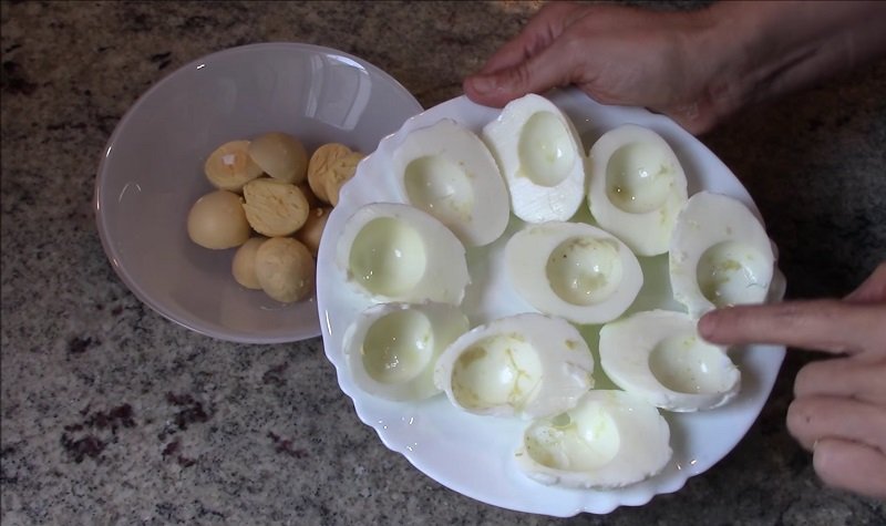 Нарежете яйцата на половина и премахнете жълтъците.