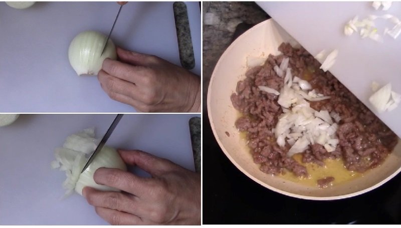 Докато месото се запържва, нарежете лука и го добавете към плънката.