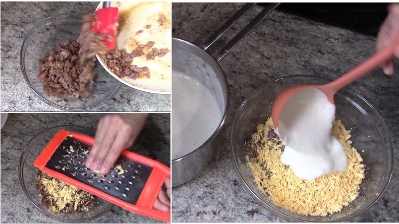 Изсипете готовата кайма в купа и добавете настърганите на ренде жълтъци. Добавете 1 черпак от соса.