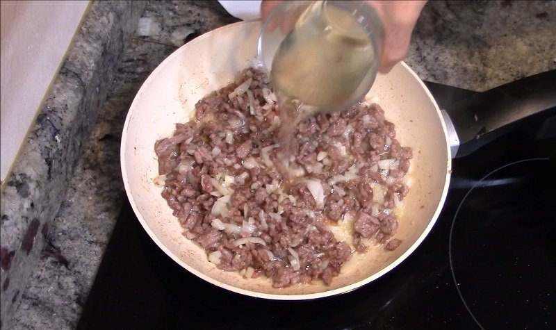 Когато лукът започне да придобива златист оттенък, е време да добавите бялото вино. Намалете огъня и оставете месото да къкри, като от време на време го разбърквате.