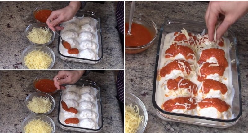 Поставете отгоре доматен сос и поръсете с настърган кашкавал. Естествено с повече кашкавал ястието ще стане по-добро на вкус.