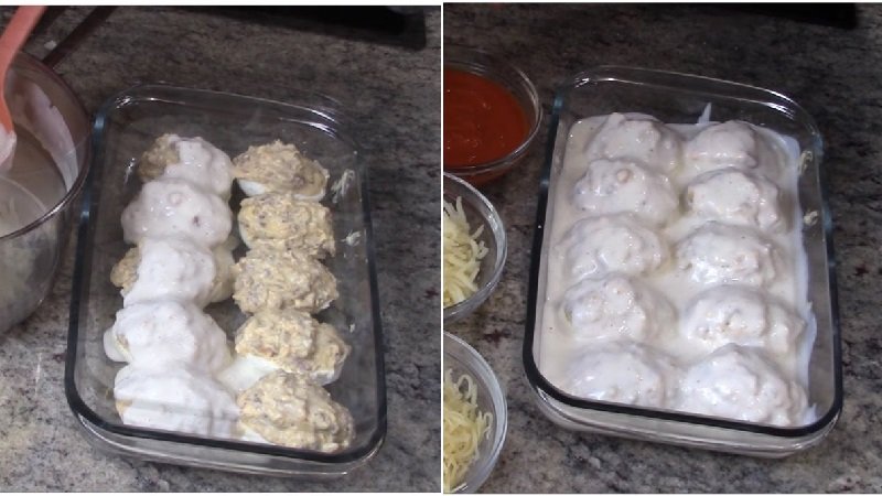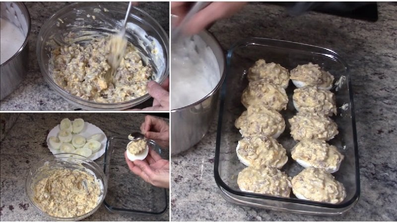 Всичко разбъркайте добре. Щедро напълнете белтъците с получената плънка и ги поставете в съд за печене.