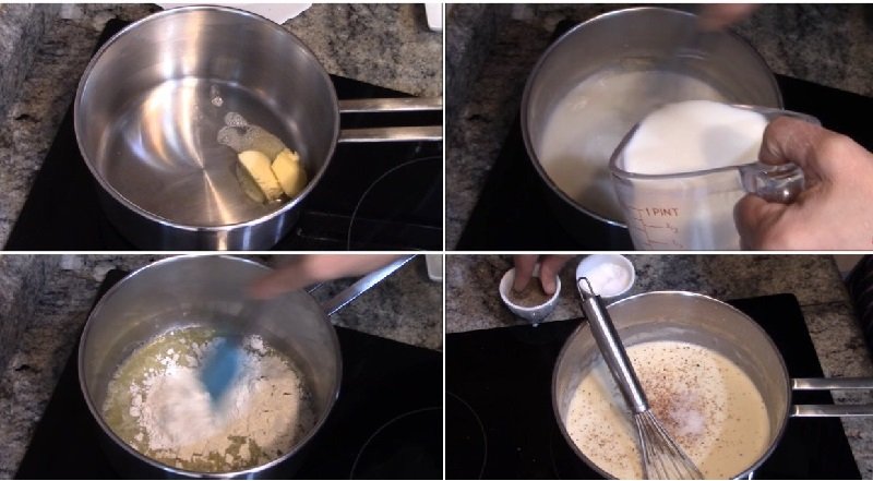 Сега пристъпете към подготовката на соса. Сложете тиган на слаб огън, добавете малко зехтин и разтопете маслото в него. Добавете към сместа брашното, разбъркайте добре. Сега започнете да сипвате млякото постепенно, като разбърквате през цялото време. Добавете подправките и продължете да разбърквате, докато сосът не достигне консистенция на сметана.