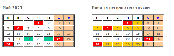 Ако си пуснете отпуск от 27 до 30 май ще имате една хубава пролетна почивка от 9 дена.