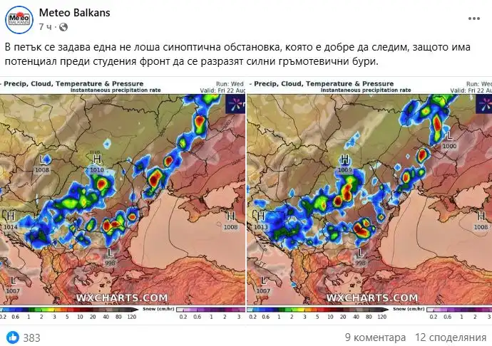 В петък се задава една не лоша синоптична обстановка, която е добре да следим, защото има потенциал преди студения фронт да се разразят силни гръмотевични бури, съобщават от Метео Балканс.