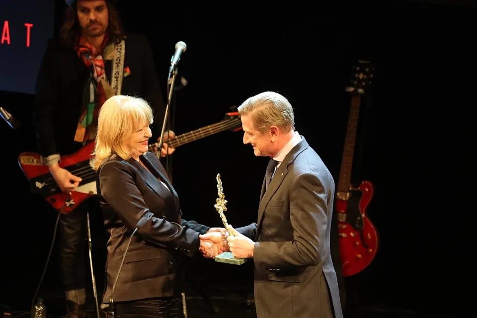 Доминик Хамерс от името на благотворителна програма „Българските добродетели“ връчва „Икар“ за изключителен принос на Анета Сотирова СНИМКИ: Ромео Чолаков
