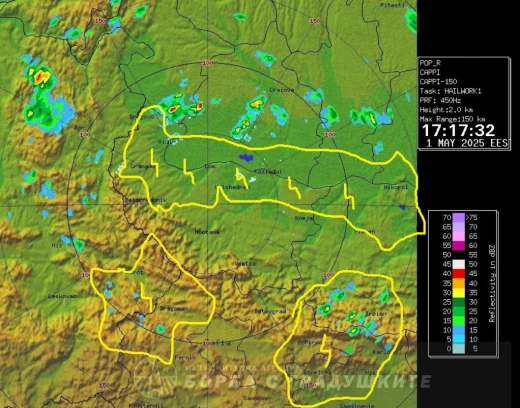 Слаби гръмотевични бури приближават нашата страна, съобщава Meteo Balkans. До 1-2 часа над оградените райони на картата ще превали и прегърми. Ще има условия и за градушка.