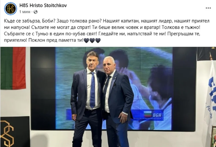 „Нашият капитан, нашият лидер, нашият приятел ни напусна! Сълзите не могат да спрат! Ти беше велик човек и вратар! Толкова е тъжно! Събрахте се с Туньо в един по-хубав свят! Гледайте ни, напътствай те ни! Прегръщам те, приятелю! Поклон пред паметта ти“, добави Стоичков в публикацията си в социалните мрежи, публикувайки обща снимка с Боби Михайлов.