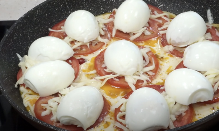 настърганата моцарела. Наредете сварените яйца отгоре, разрязани наполовина, поръсете със сирене.