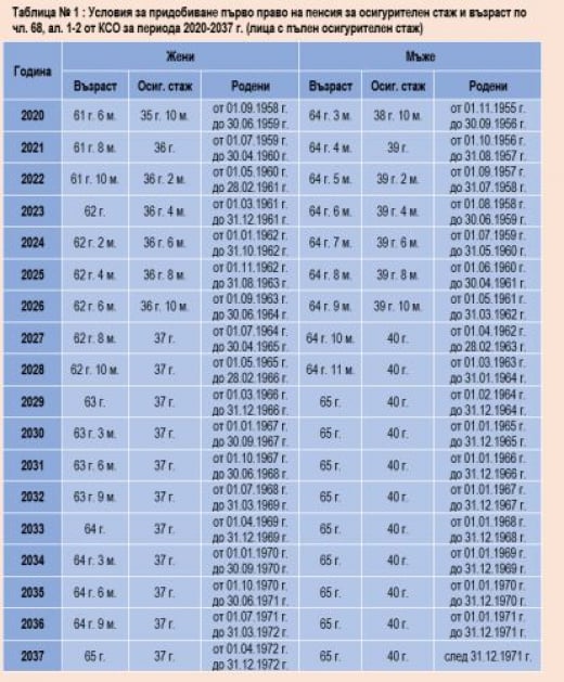 Условията за придобиване първо право на пенсия за осигурителен стаж и възраст според датата на раждане на съответното лице както за миналата и настоящата, така и за следващите години, са показани в таблицата по-долу.