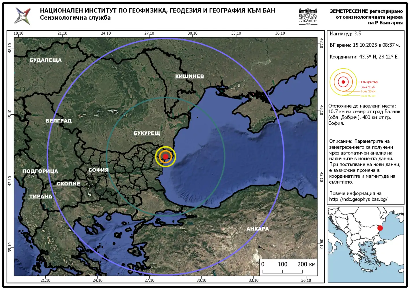 Епицентърът му е в близост до добричкото село Соколово, община Балчик, а магнитудът му е 3,5 по скалата на Рихтер, по данни на НИГГГ към БАН. Според Европейския сеизмологичен център силата му е била 3,3.